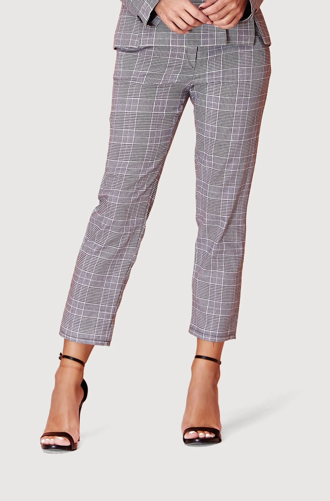 Klasyczne szare spodnie garniturowe w czarno-białą kratkę z domieszką wełny. Spodnie zostały wykonane z bardzo dobrego materiału, mającego w składzie 80% bawełny i 20% wełny. Charakteryzują się eleganckim prostym fasonem. Długość kończy się przed kostką, co nadaje im subtelnego wyrafinowania i sprawia, że prezentują się doskonale zarówno z eleganckimi szpilkami.
