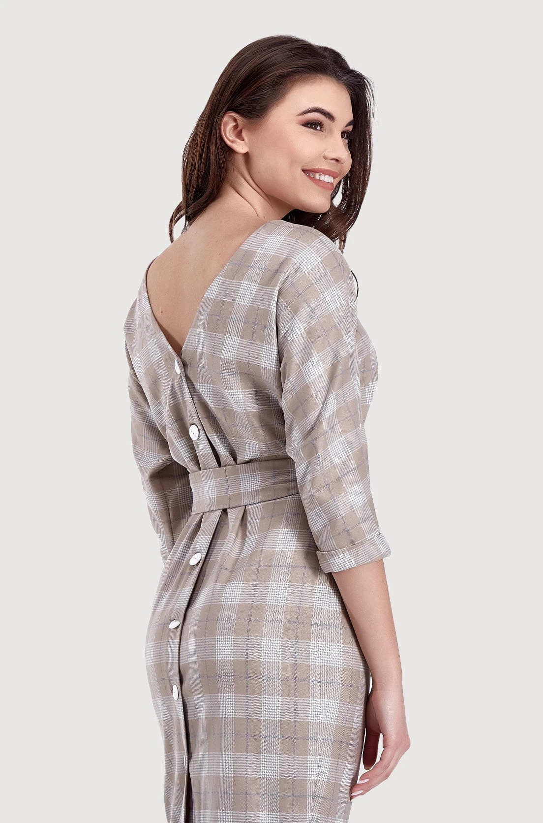 Jej tył z guzikami i dekoltem V sprawiają, że sukienka prezentuje się bardzo kobieco. Talia dodatkowo podkreślona jest paskiem, co dodaje jej charakteru. Rękawy 3/4 zapewniają swobodę ruchy i dają wiele możliwości na dopełnienie stylizacji zegarkiem czy bransoletką.